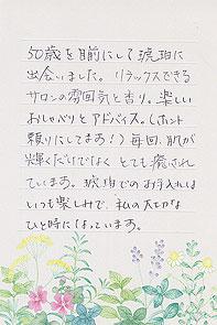 クレンジング⇒洗顔⇒角質ケア⇒イオン導入⇒高周波⇒デコルテマッサージ⇒フェイシャルマッサージ⇒パック⇒ハンドマッサージ⇒整肌