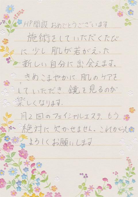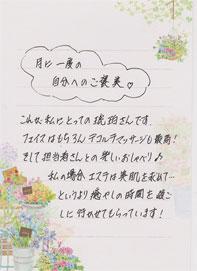 クレンジング⇒洗顔⇒角質ケア⇒低周波⇒デコルテマッサージ⇒フェイシャルマッサージ⇒パック⇒ハンドマッサージ⇒整肌